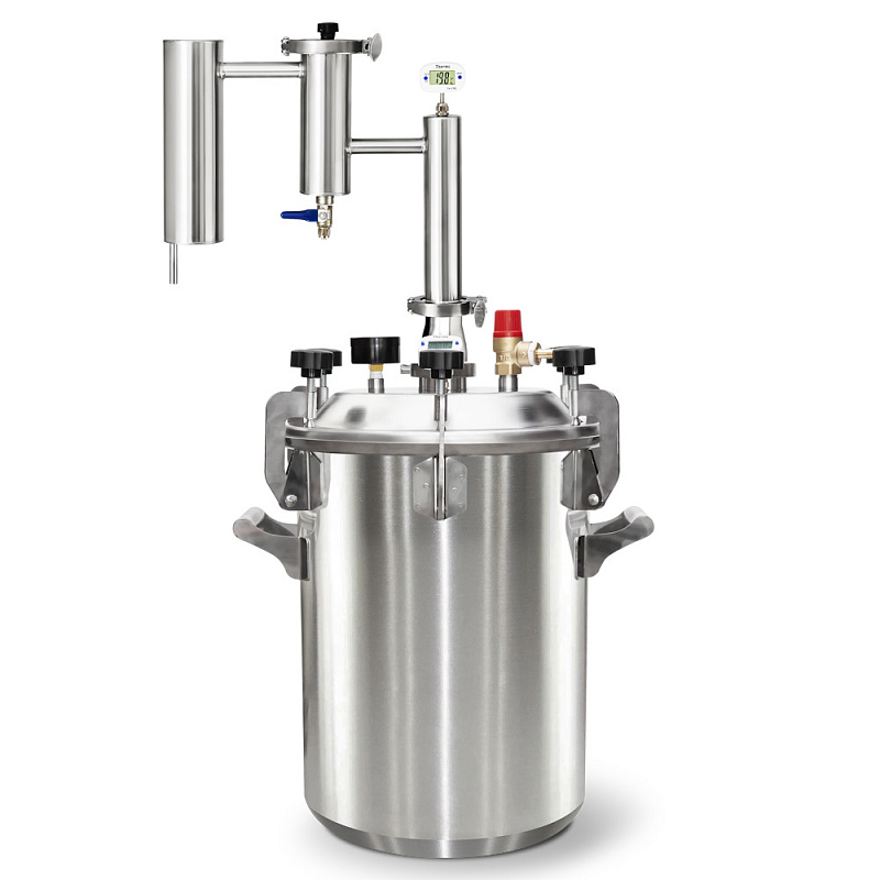 Он может использоваться не только для консервирования. Кламп 2 дюйма на крышке позволяет присоединить любой дистиллятор или бражную колонну и использовать автоклав как самогонный аппарат.