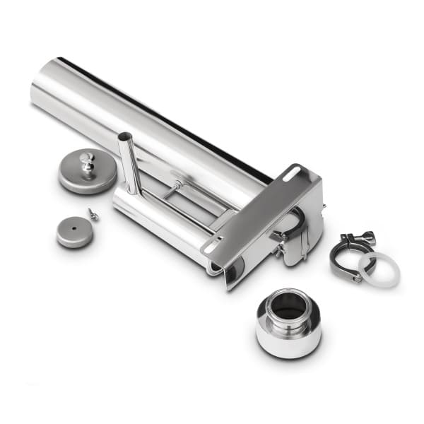 Устройство дымогенератора для копчения не являет из себя сложную систему и состоит из таких элементов: 1. Цилиндрическая емкость корпуса. Лучшим материалом для эксплуатации считается нержавеющая сталь, не подвергающаяся коррозии. 2. Дымоход. Крепиться к корпусу и обеспечивает отвод дымовой смеси от эжектора в коптильную камеру. 3. Эжектор, как инструмент для создания хорошей тяги; 4. Компрессор. Дымогенератор для холодного копчения обязан иметь средство для улучшения тяги и смешивания воздуха с выработанным дымом внутри корпуса, то есть эжектор.