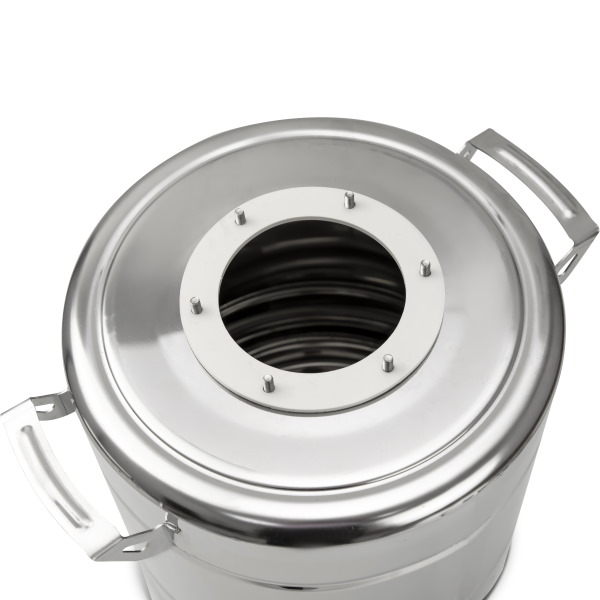 Это классический перегонный бак - кастрюля с фланцевым креплением. Дистиллятор надежно крепится при помощи шести стальных барашков. За герметичность отвечает прокладка из пищевого силикона.