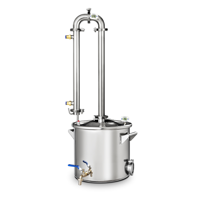 - Электронный термометр установлен на крышке бака, что позволяет контролировать температуру восходящих спиртовых паров.