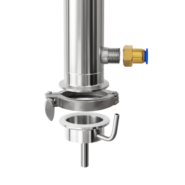 Съемный носик с атмосферным выходом Съемный носик устанавливается после холодильника, как финальный элемент дистилляционной системы. Он собирает капающий конденсат и выводит его наружу через патрубок.